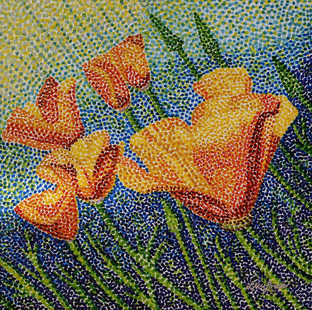 What visually moved me to paint “Almond Valley Snow” was the quiet awakening within - of serenity and beauty that nature gives us all. The colorful dots of shimmering calmness counterbalances life’s chaos; a reminder to me that color, light and joy can heal one’s soul.